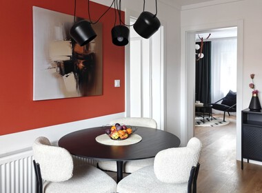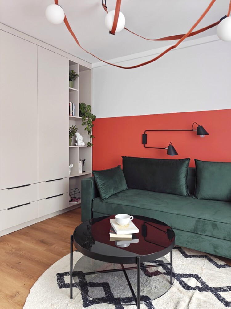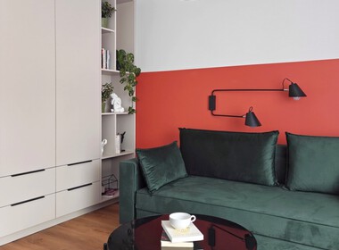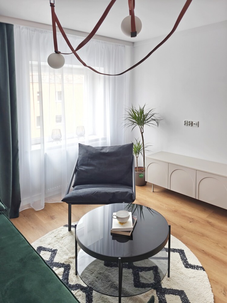 Mieszkanie w pełni umeblowane m.in. w stół jadalniany i krzesła, meble na wymiar, rozkładaną dużą kanapę z pojemnikiem na pościel, stolikiem kawowym i szafkę rtv.