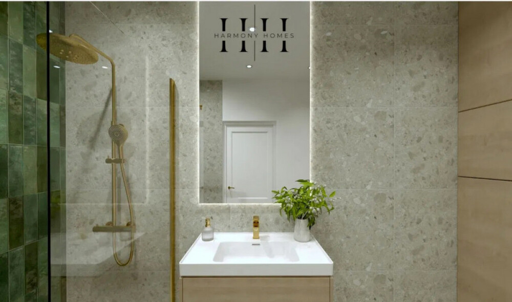 -Łazienka wykończona płytkami gresowymi w dużym formacie,