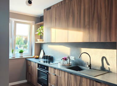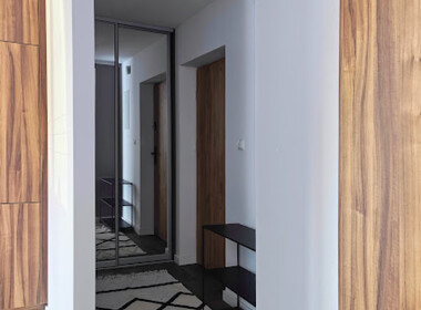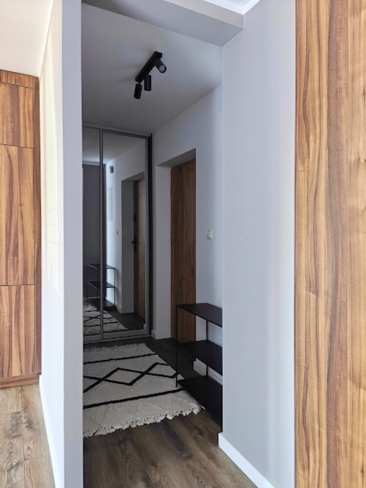 Mieszkanie w pełni umeblowane m.in. w stół jadalniany i krzesła, meble na wymiar, rozkładaną dużą kanapę z pojemnikiem na pościel, stolikiem kawowym i szafkę rtv.