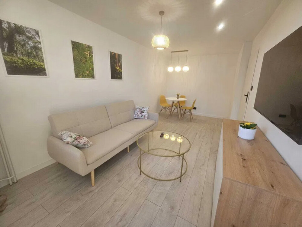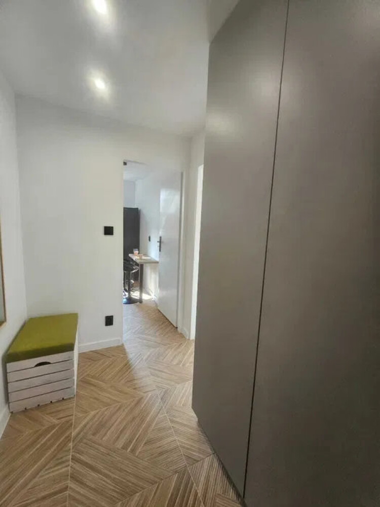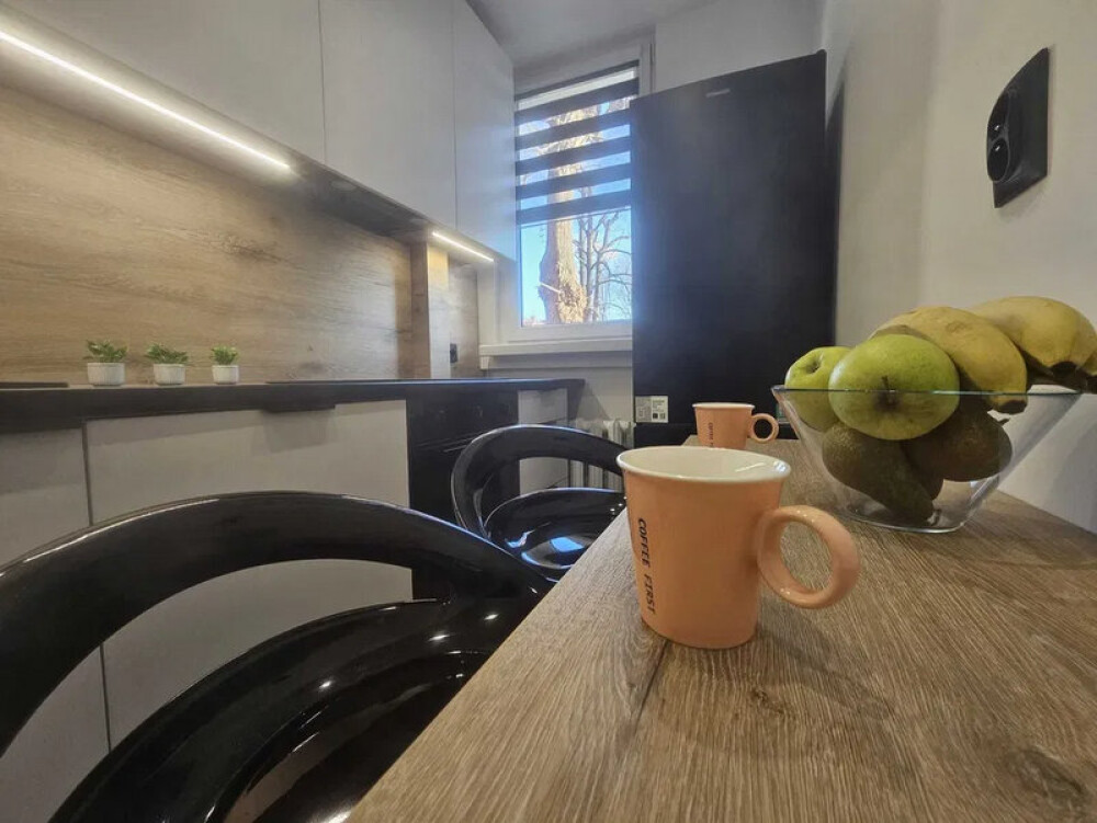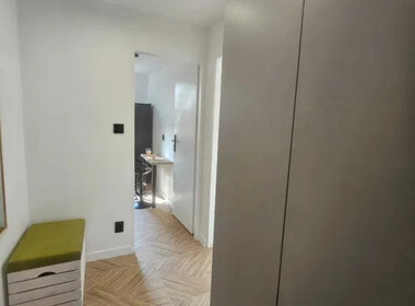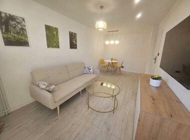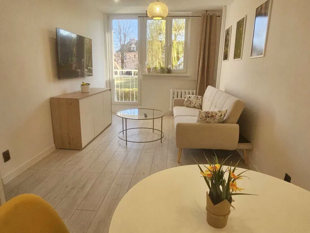 -pokój z balkonem francuskim (możliwość techniczna + zgoda zarządcy budynku na dobudowanie balkonu nadwieszonego), pomieszczenie umeblowane w: sofę rozkładaną, ławę, stół z krzesłami, obszerną komodę, smart TV 55 "