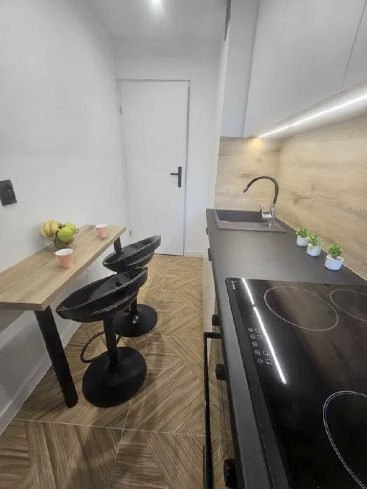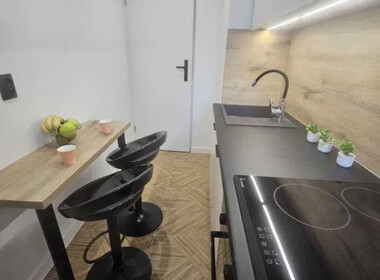 -osobna, widna kuchnia (meble "na wymiar" wraz ze sprzętem AGD: pełnowymiarowa płyta elektryczna, piekarnik elektryczny, zmywarka, duża lodówka z zamrażalnikiem, okap kuchenny)