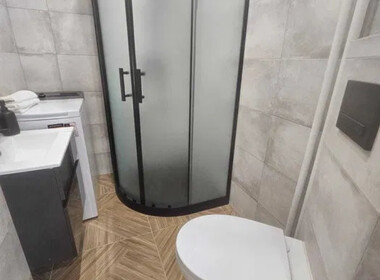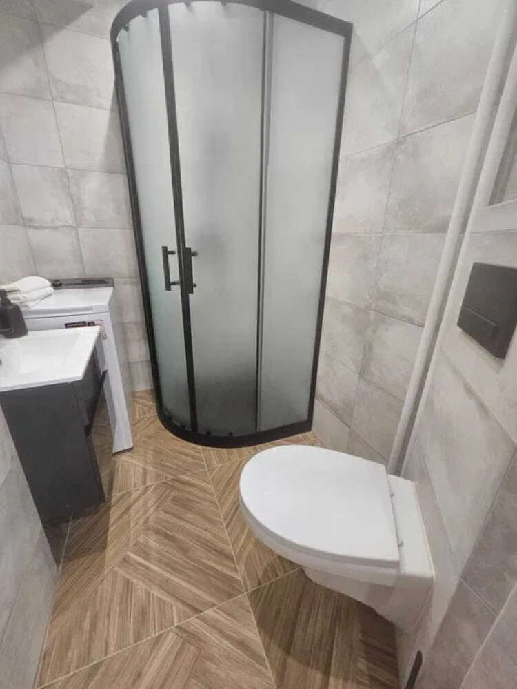 -łazienka z narożną kabiną prysznicową, wyposażona w pralkę