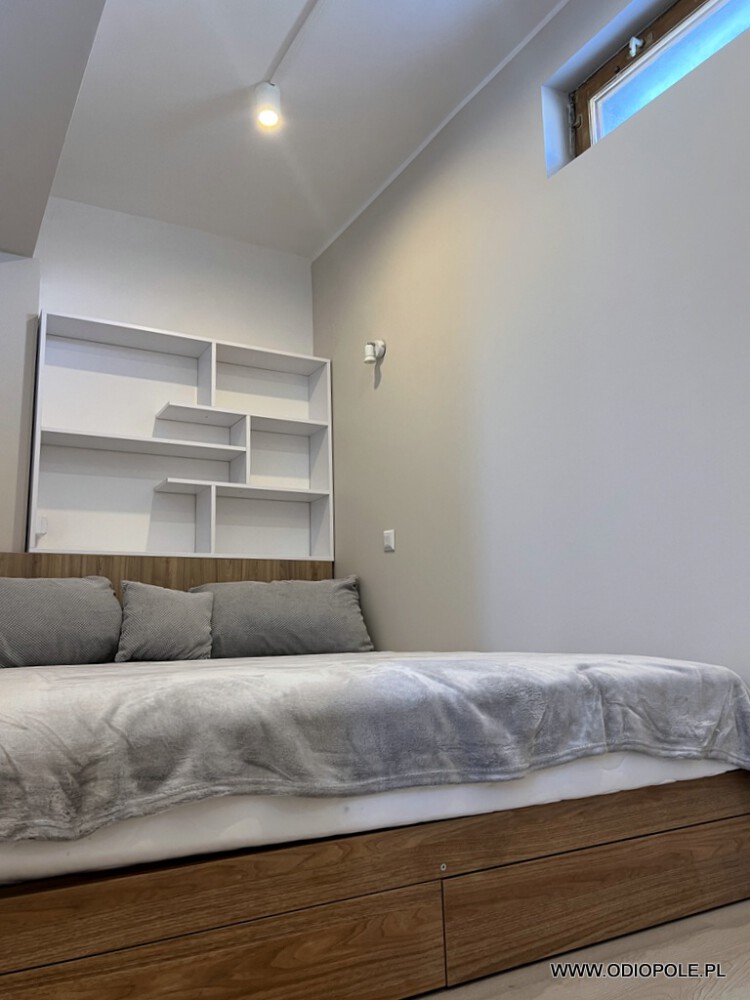 )✔ Sypialnia – wygodne łóżko z szufladami oraz pojemna zabudowa