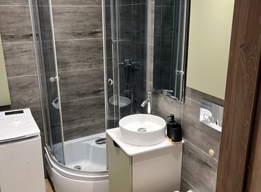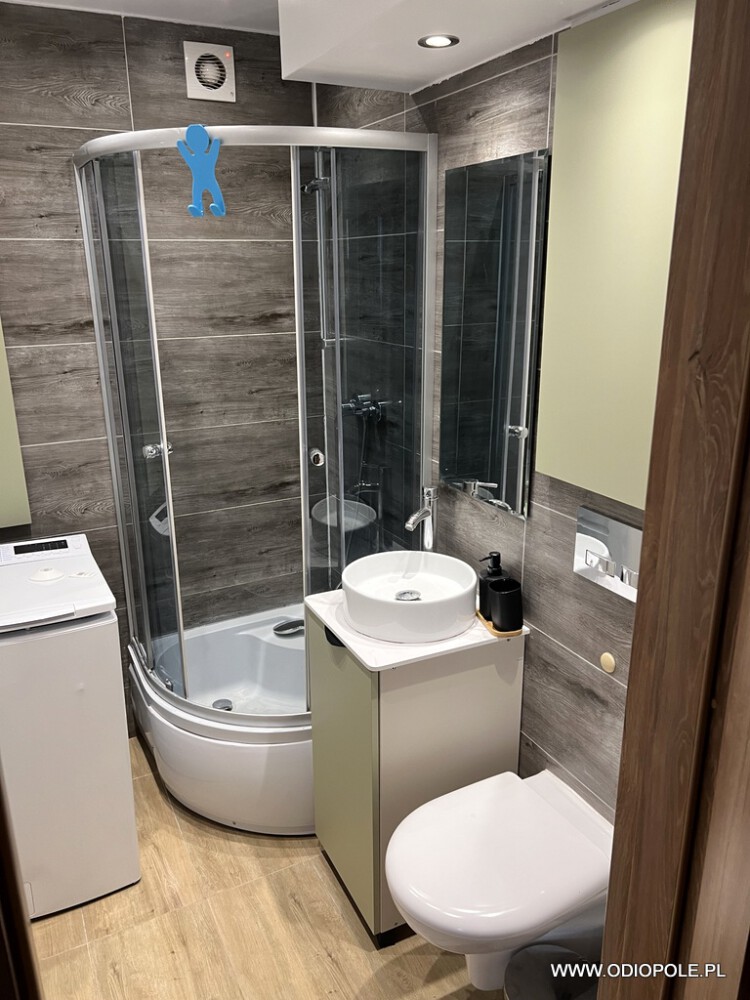 ✔ Łazienka – nowoczesna, z prysznicem, zabudową meblową i pralką